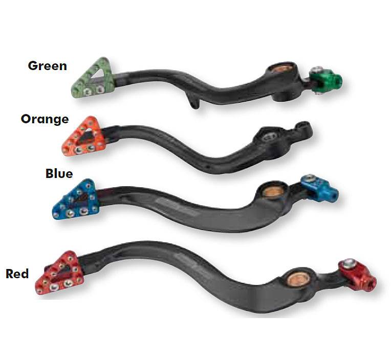 - The brake pedal arm is anodized in a matte black finish and the tips are anodized in colors per bike brand